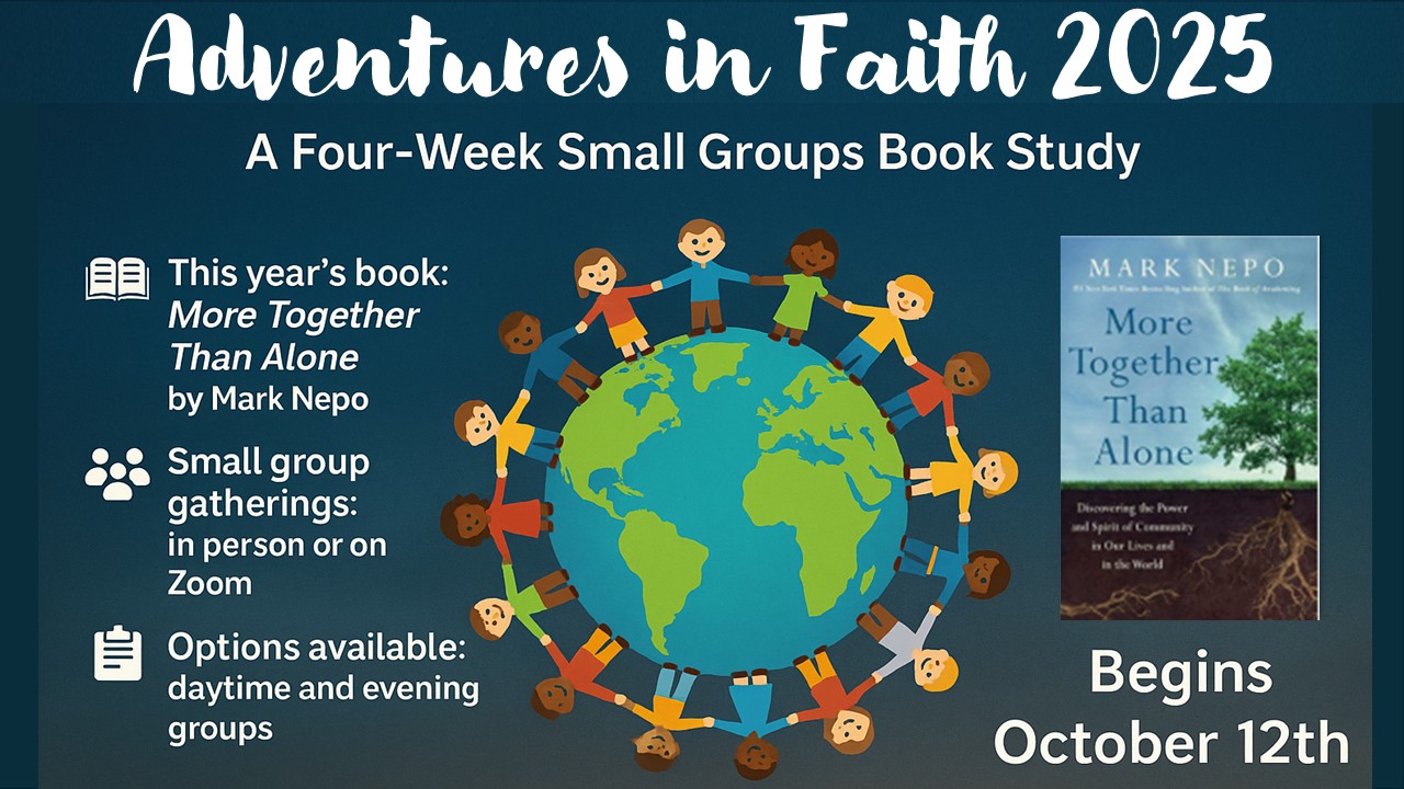 We are so excited about this year’s book, “More Together Than Alone” by Mark Nepo. We will gather in small groups either on zoom or in person and journey through this book together. Please sign up at the back table on Sundays. We have day-time groups, evening, in person or on zoom.
