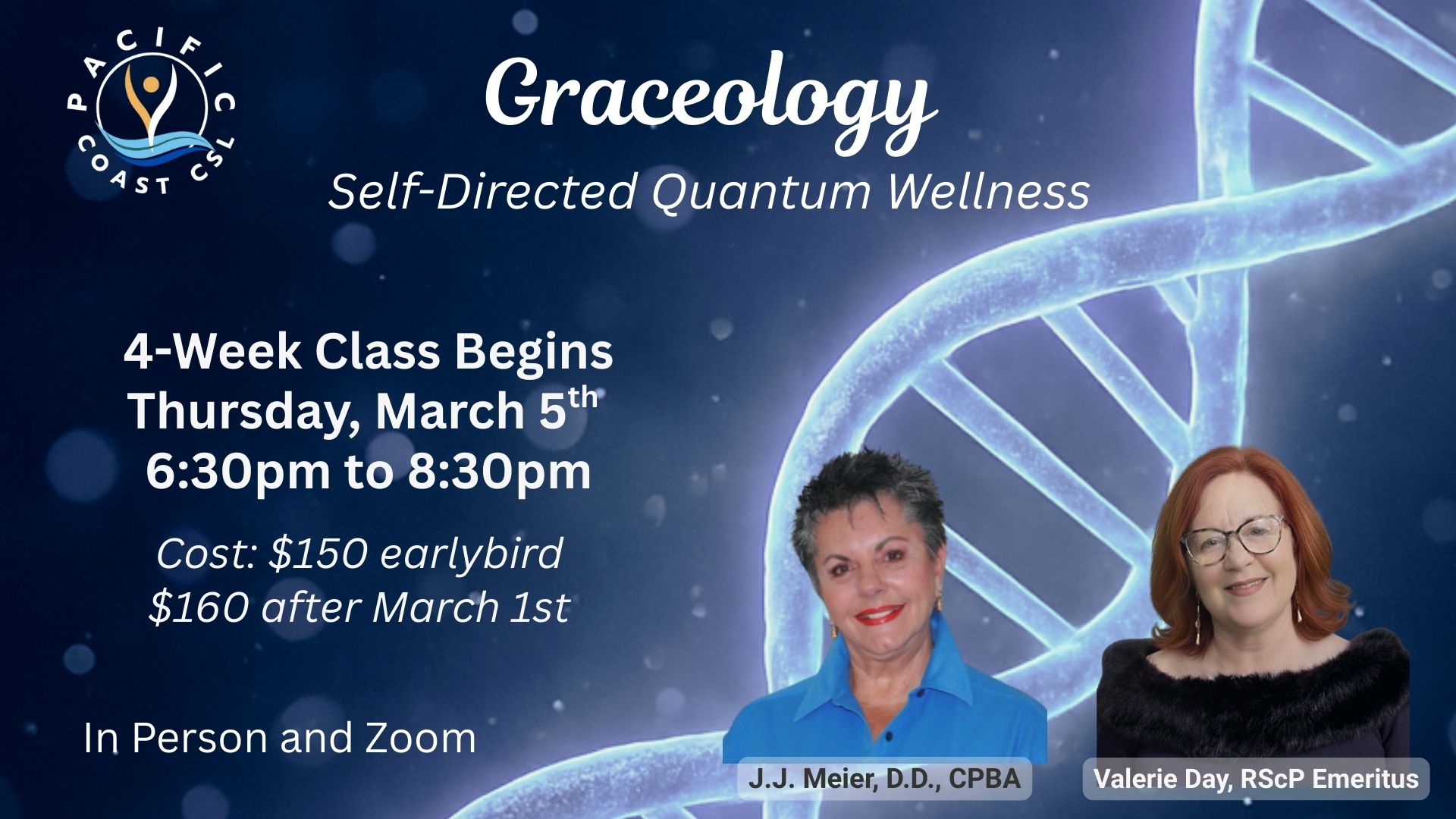 Graceology a four- session Self-directed Quantum Wellness Program that can measurably improve personal “wellness quotient”. Participants take away a renewed sense of well-being through frequency-based knowledge, techniques and recalibrated beliefs about being well. Graceology offers new choices from a multi-dimensional approach at the nexus of Science, Grace, Faith and Spirituality that moves each individual from...