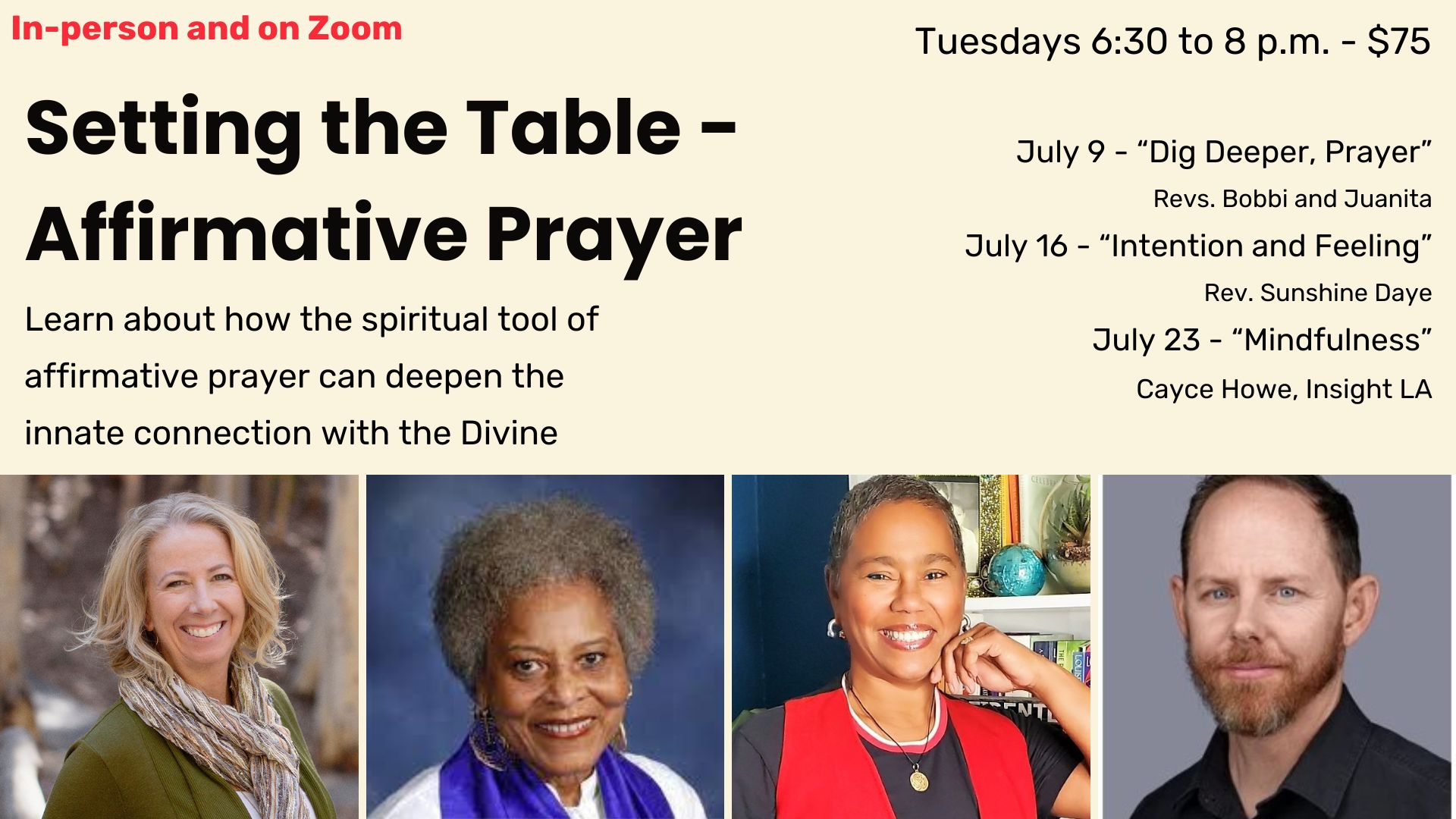 Prayer is a powerful spiritual practice in the teachings of Science of Mind. Join us as we go deeper into our inner dialog in and around prayer, making it more accessible for all. We will explore the history of prayer, unpack our own beliefs around it, learn how to approach prayer with intention and feeling,...