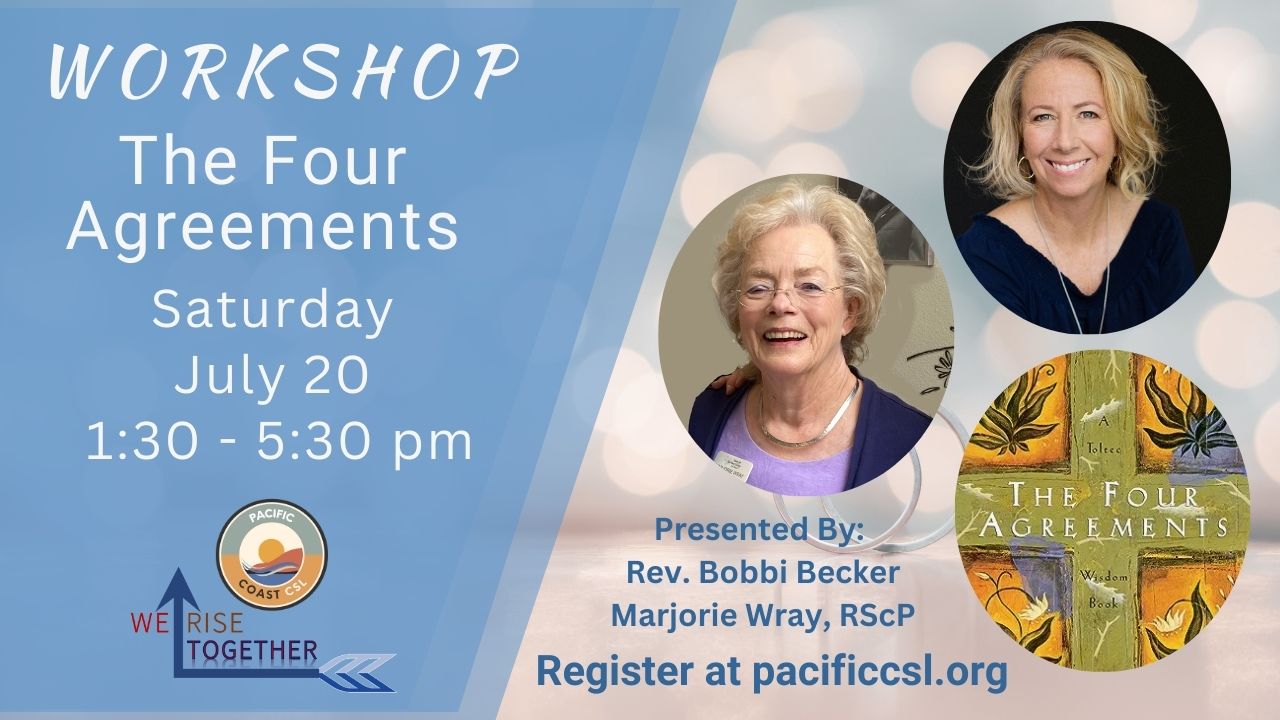 Details: Sat., July 20, 2024 1:30 p.m. - 5:30 p.m. Drawing from ancient Toltec wisdom, These Four Agreements present a potent code of conduct capable of swiftly reshaping our lives, ushering in a fresh era of freedom, genuine happiness, and love. Embark on an interactive journey with Rev. Bobbi Becker, supported by Practitioner Marjorie Wray,...
